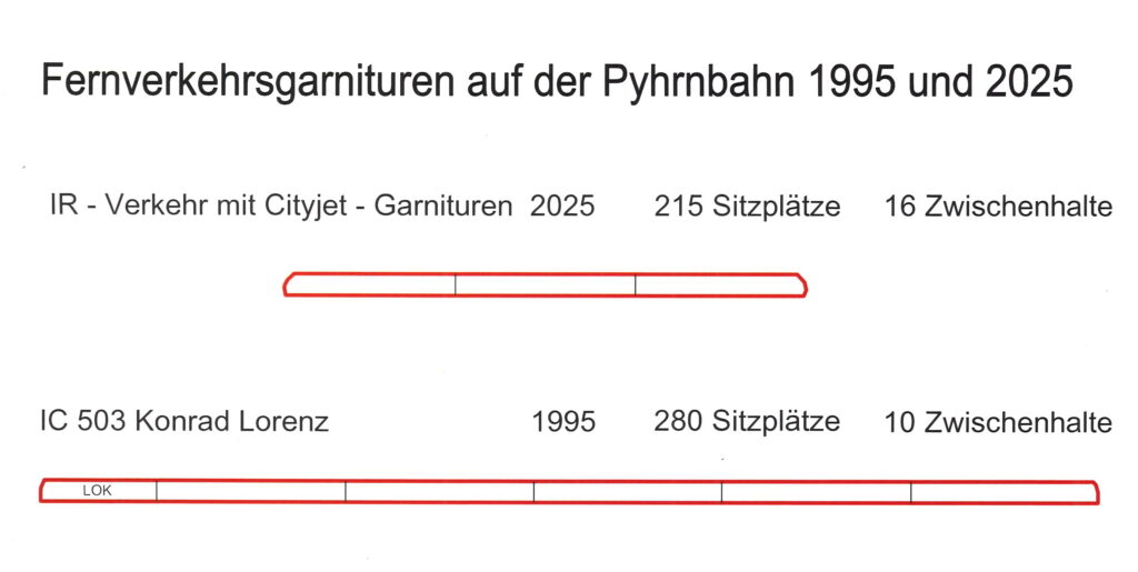 So war zum Beispiel die Fernverkehrsgarnitur auf der Strecke Linz – Graz in den 90er Jahren mit rund 35 Prozent mehr Sitzplätzen (und 5 statt 2 WC) doppelt (!) so lange wie die jetzt eingesetzten Cityjet-Züge.