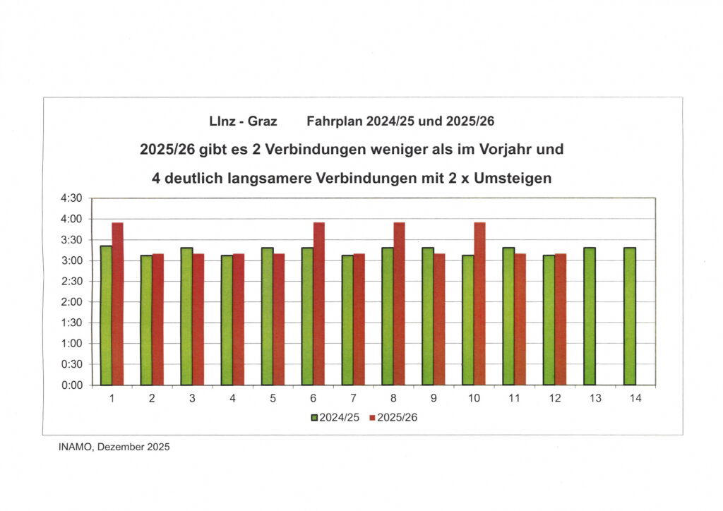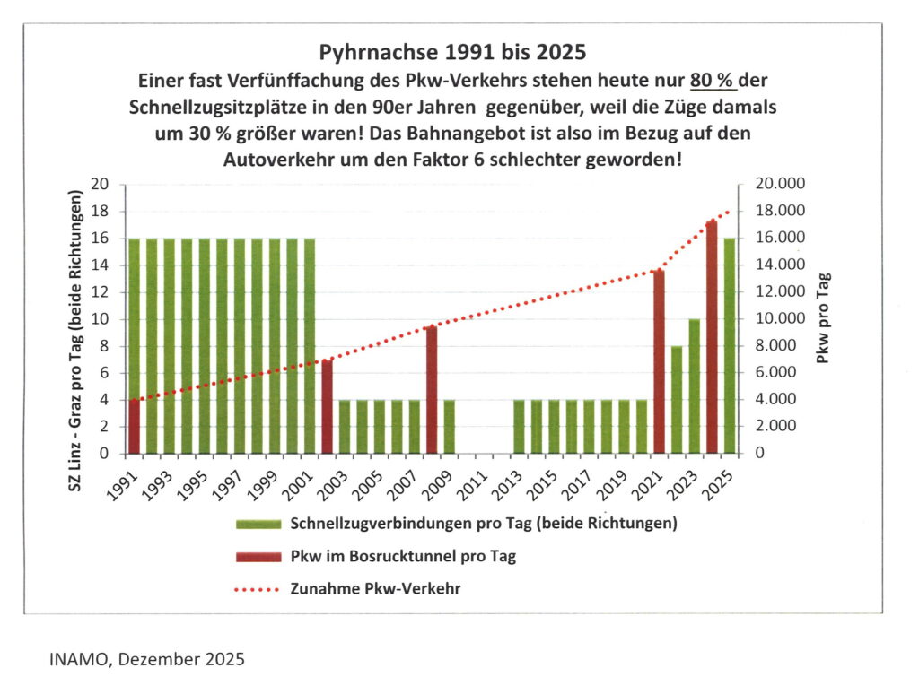 Die schnellste Bahnverbindung Linz – Graz ist mit 3 h 11 min noch immer rund 20 Minuten langsamer, wie sie schon vor 20 Jahren war. Bei jedem Ausbauvorhaben auf der Pyhrnstrecke wurde das Argument der Streckenbeschleunigung angeführt. Weitergegeben wurde sie bisher noch nicht an die Bahnkunden. Zeiten von 2 h 45 min wären heute schon möglich.