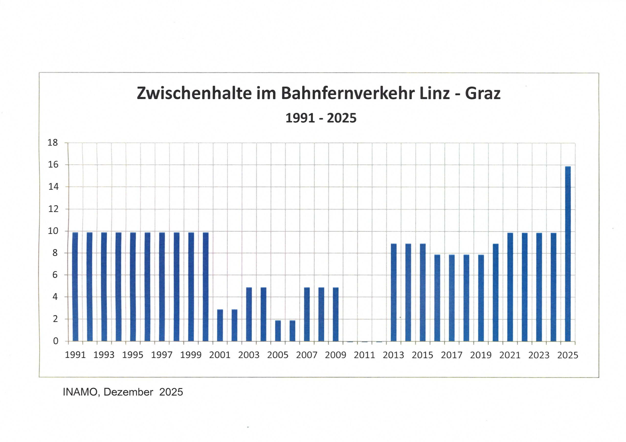 Der in den letzten 31 Jahren maximale Wert an Zwischenhalten im Fernverkehr zwischen Linz und Graz von 10 wird im aktuellen Fahrplan um 60 % auf sagenhafte 16 Stops erhöht (d.h. Stops alle 15 km im REX-Haltemuster).