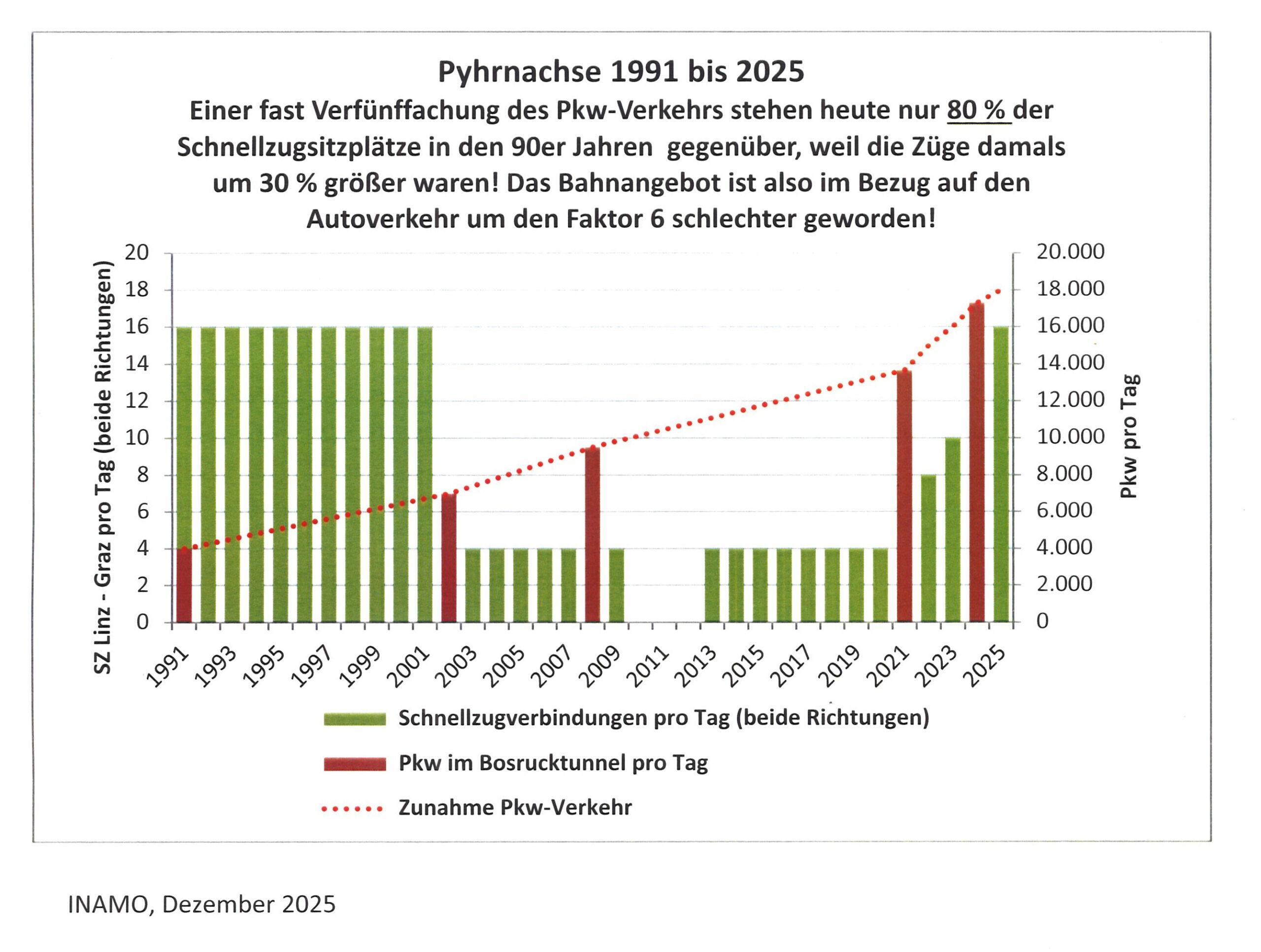 Die schnellste Bahnverbindung Linz – Graz ist mit 3 h 11 min noch immer rund 20 Minuten langsamer, wie sie schon vor 20 Jahren war. Bei jedem Ausbauvorhaben auf der Pyhrnstrecke wurde das Argument der Streckenbeschleunigung angeführt. Weitergegeben wurde sie bisher noch nicht an die Bahnkunden. Zeiten von 2 h 45 min wären heute schon möglich.
